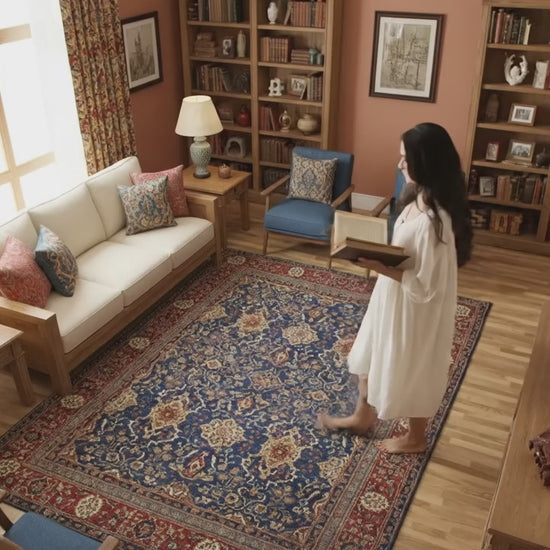Indigo Blue Central Field: The heart of the rug is a sumptuous field in a deep and enveloping Indigo Blue. This rich and vibrant shade forms the perfect base for the lavish design that unfolds upon it.