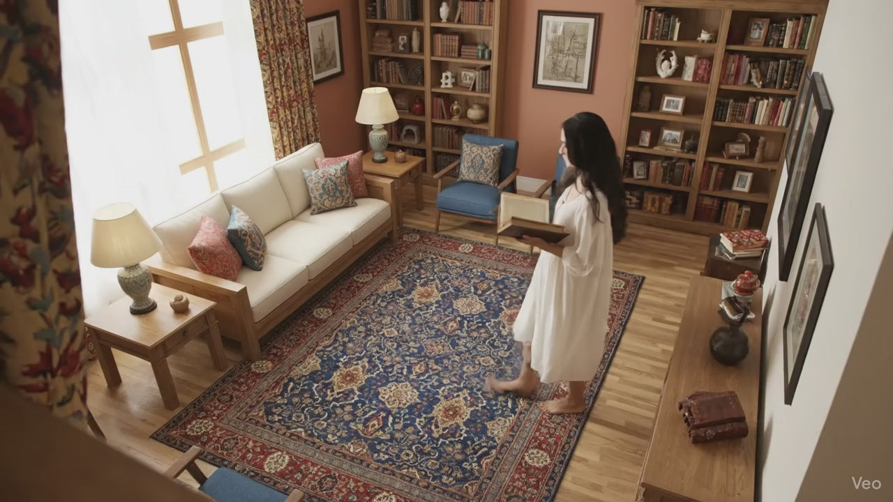 الحقل المركزي الأزرق النيلي: قلب السجادة هو حقل فخم بلون أزرق نيلي عميق ومغلف. تشكل هذه الدرجة، الغنية والنابضة بالحياة، الأساس المثالي للتصميم الفخم الذي يتكشف عليها.